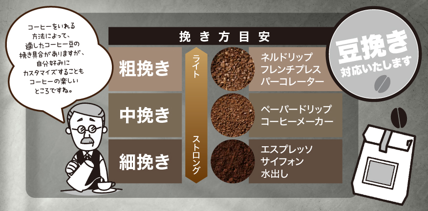 豆挽きをお希望のお客さまはご購入時にお申し付けください。