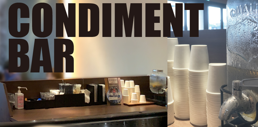お砂糖、ガムシロップ、ミルクの他にもマドラーやおしぼり、ウォーターサーバーをご用意しています。