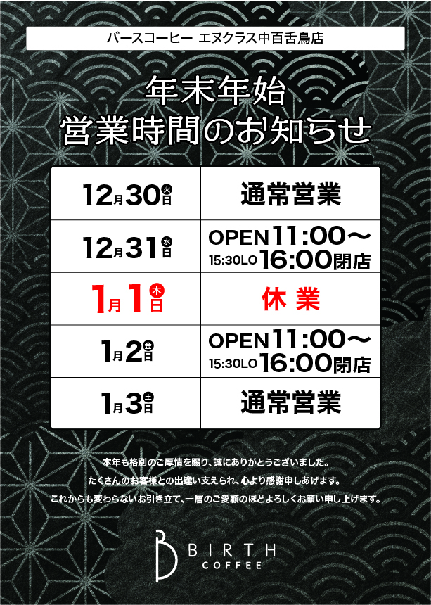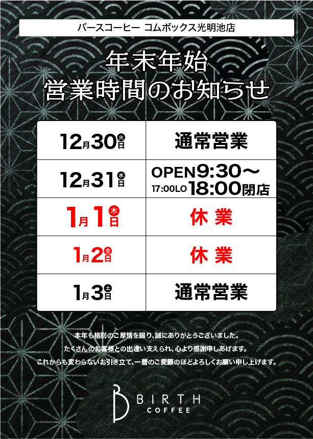 年末年始の営業時間は、下記掲載の通り通常と変更になります。