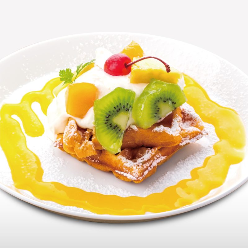焼きたてのワッフルにたっぷりのクリームと、旬のフルーツを使った贅沢な一品です。